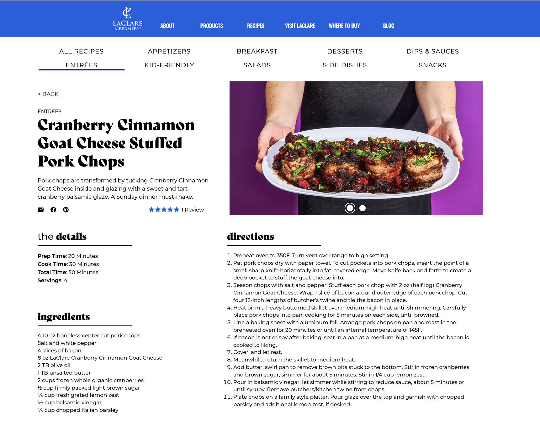 The site was designed to serve two purposes simultaneously: a brand storytelling platform that communicated LaClare's craft and heritage, and a recipe-driven content hub that gave consumers a reason to keep coming back and new ways to think about goat cheese in their everyday cooking.