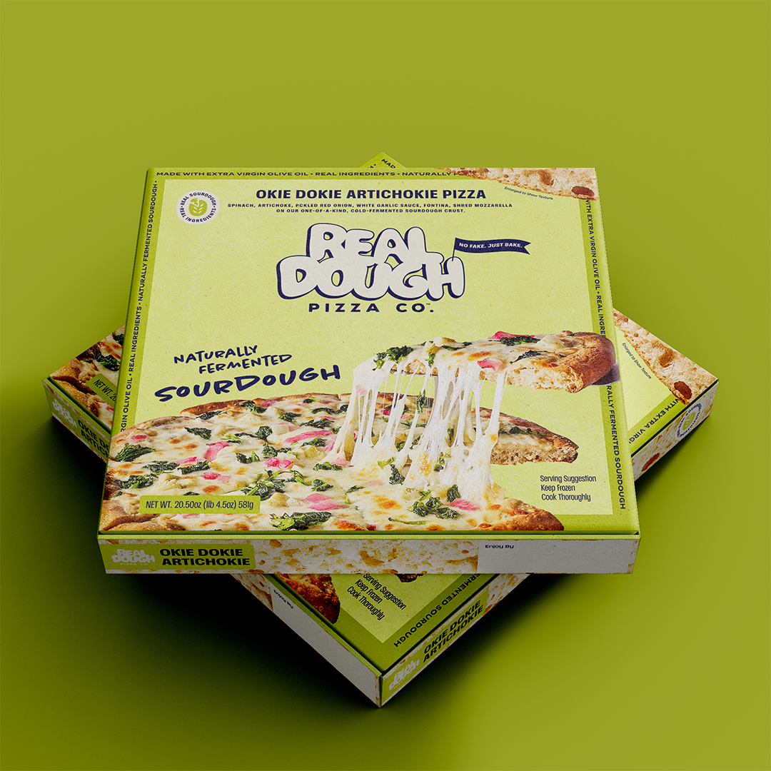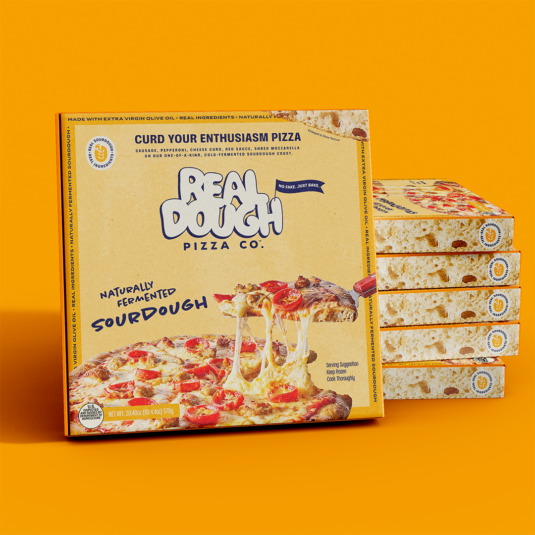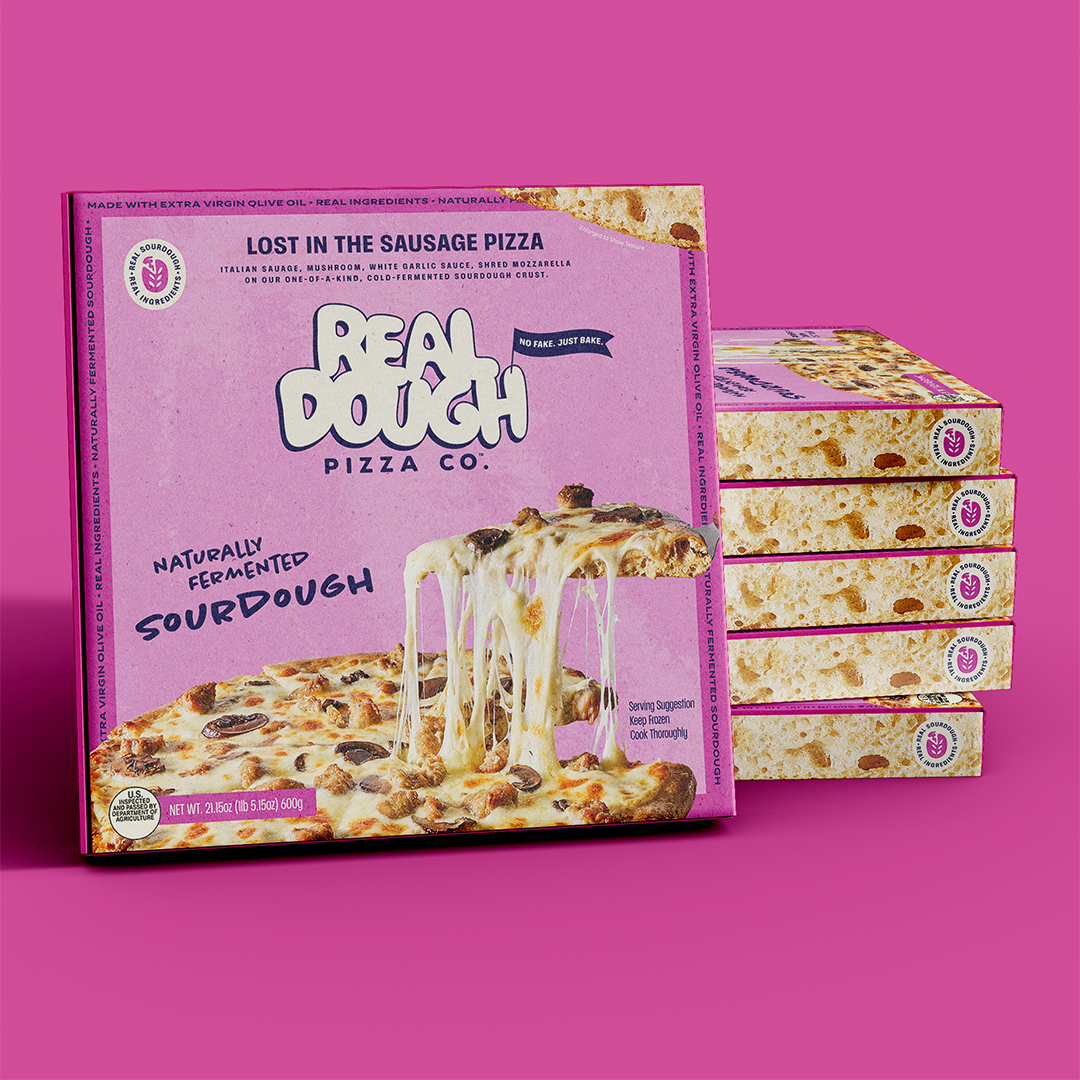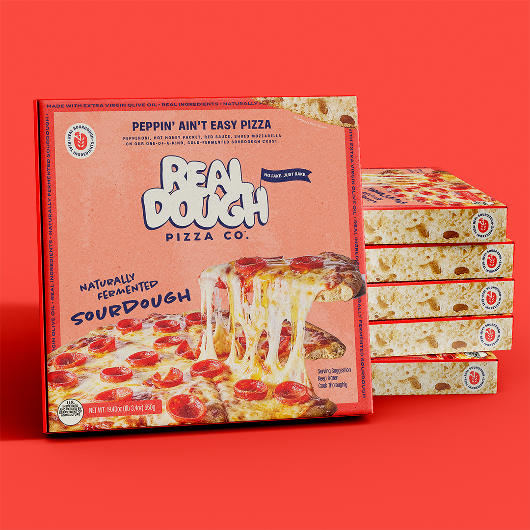 The frozen pizza category is a sea of sameness: predictable packaging, forgettable names, the same visual language recycled across dozens of brands. Real Dough needed to look, sound, and feel like nothing else on the shelf while still communicating the craft and quality at the heart of the product. And it needed to do all of that from a standing start, with no brand equity to build on.