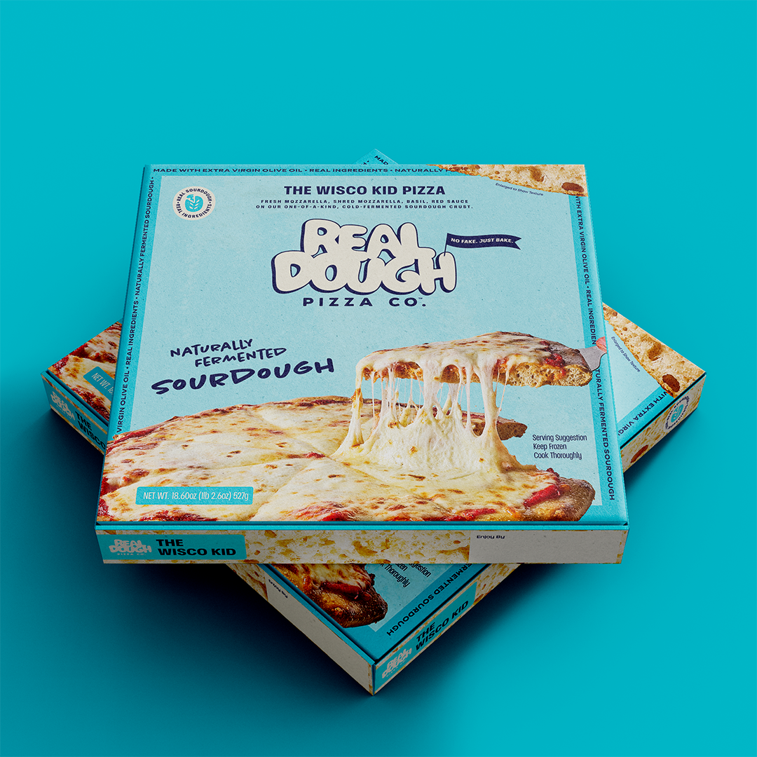 Real Dough Pizza Co. launched in February 2025 into four Wisconsin retailers — Sendik's, Festival Foods, Piggly Wiggly, and Woodman's — with five SKUs on shelf and a brand built to earn its place there.